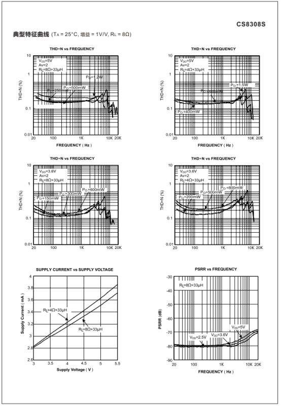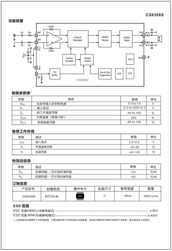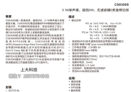 一 CS8308S的应用信息 1 典型应用图2 管脚分布及定义3 基础参数4 特性曲线图5 DEMO除了这款小功率的单声道音频功率放大器,还有两款类似的推荐