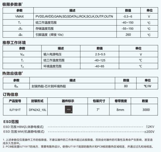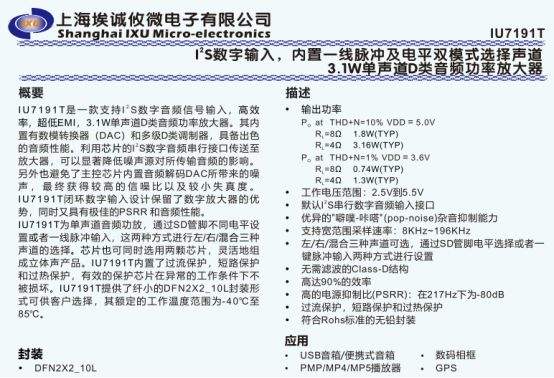 USB 音箱、便携式播放器、GPS 等设备的音频系统设计中,音频 IC 的性能直接影响设备的音质输出与运行稳定性,而选择一款兼具低噪声、高效率与灵活适配性的音频功率放大器,往往是解决设计痛点的关键 —— IU7191T 单声道 D 类音频功放,恰好能匹配这类需求。