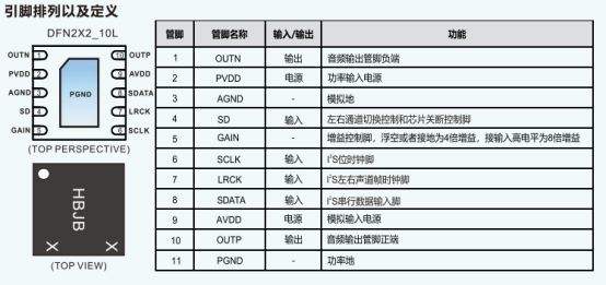 这款 D 类音频功放支持 I²S 数字音频输入,内置数模转换器(DAC)与多级 D 类调制器,可显著降低噪声源对音频传输的影响,同时避免主控芯片内置 DAC 带来的噪声,最终实现较高信噪比与较小失真度,贴合设备对音质的核心要求。其 2.5V~5.5V 的宽工作电压范围适配不同供电场景,在 4Ω 负载、VDD=5V 条件下典型输出功率达 3.16W,最高 90% 的效率还能减少功耗,搭配纤小的 DFN2X2_10L 封装,也能满足设备小型化布局需求。