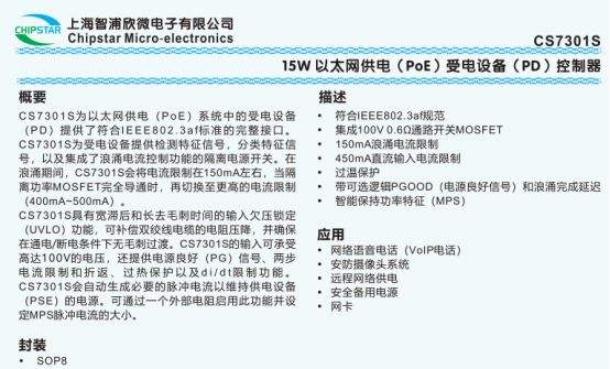 在网络语音电话(VoIP 电话)、安防摄像头系统、远程网络供电设备的设计中,一款符合标准、兼具稳定性与兼容性的 PoE PD 控制器,是保障以太网供电系统可靠运行的关键 —— CS7301S/CS7302S 15W PoE PD 控制器系列,恰好能匹配这类需求。该系列作为以太网供电系统中的受电设备(PD)接口方案,完全符合 IEEE802.3af 规范,单颗支持 15W 功率输出,可满足中小型网络设备的供电需求。