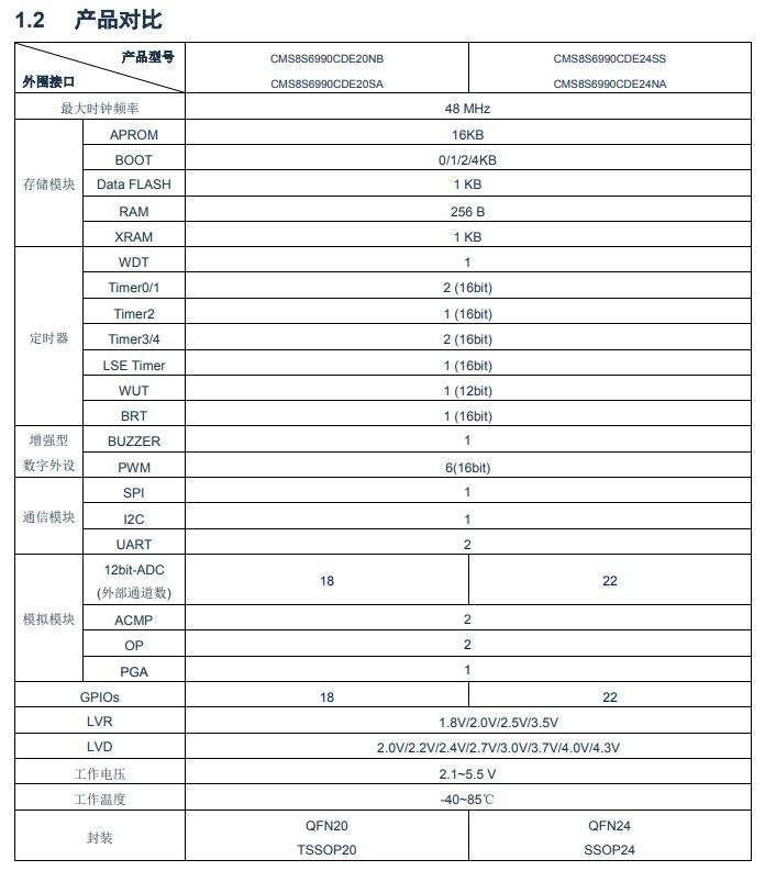 产品特性:> 8051> 工作电压:2.1V-5.5V> 工作温度:-40℃-85℃> 16K x 8Bit Flash> 256 x 8Bit RAM + 1K x 8Bit XRAM> 1K x 8Bit Data Flash> 5个16位定时器 + 1个LSE定时器 + 1个唤醒定时器> 2个UART + 1个SPI + 1个I2C> 内置12位高精度ADC,带内部基准电压和多种内部参考电压,最多达22个外部通道> 6通道PWM模块,可设置3组互补输出> 2个运放 + 2个比较器 + 1个PGA> 内置LVD模块,多种电压可选> 所有数字功能支持自由映射到所有GPIO> 22个GPIO> 96位唯一ID> 封装类型: CMS8S6990CDE24NA QFN24、CMS8S6990CDE24SS SSOP24、CMS8S6990CDE20NB QFN20、CMS8S6990CDE20SA TSSOP20需求咨询 中微代理 杨生 13250262776 同微、QQ 3400632246