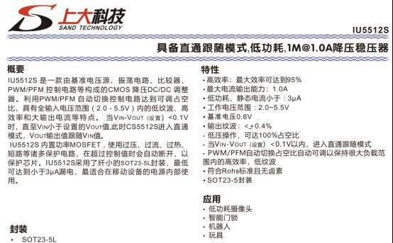 在低功耗摄像头、智能门锁、机器人、玩具等便携设备的供电设计中,常面临封装空间受限、功耗敏感、电压适配范围窄及输出稳定性不足等问题,IU5512S可针对性应对这些需求。该器件是一款CMOS降压DC-DC调整器,采用SOT23-5L纤小封装,输入电压范围2.0~5.5V,最大输出电流1.0A,静态电流小于3μA,漏电低至3pA以内,能有效适配低功耗设备长续航需求。