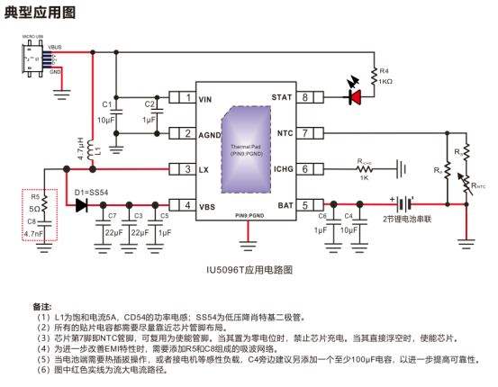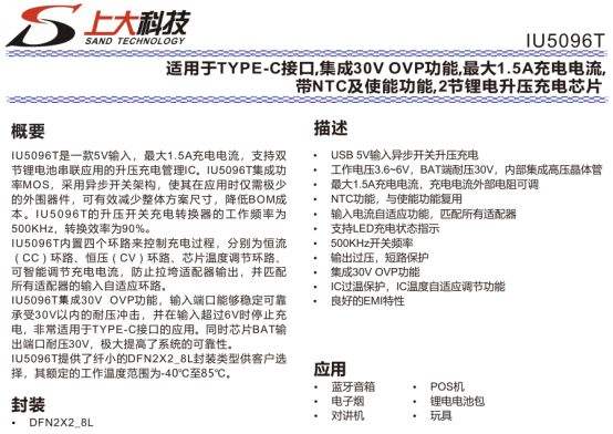 IU5096:适用于TYPE-C,30V OVP,最大1.5A充电电流,带NTC及使能功能,2节锂电升压充电芯: