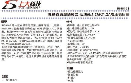 IU5510:针对先进制程主控,具备直通跟随模式,低功耗,1.2M@1.2A降压DCDC稳压器: