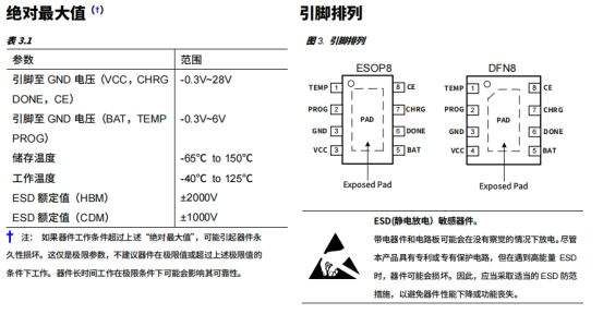 它在封装、引脚功能、充电逻辑上与 TP4056 高度匹配:封装涵盖 ESOP8DFN2×2-8DFN3×3-8,与 TP4056 常见封装一致,无需修改 PCB 布局;核心引脚功能对应,PROG 引脚可通过外接电阻调节充电电流(300mA 以上公式 I_BAT=1000/R_PROG300mA 以下为 900/R_PROG),CHRG(充电指示)、DONE(充满指示)引脚逻辑相同,均为漏极开路输出,LED 限流电阻选型一致(推荐 1K 以上),TEMP 引脚支持 NTC 温度检测(不用时接地),CE 引脚控制芯片使能(高电平工作、低电平关断),替换时无需调整控制逻辑。
