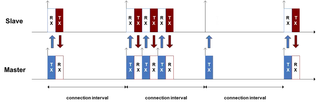 在一个连接中,双方大部分时间都在休眠,只在每个连接间隔到期时同时唤醒,进行一次“连接事件”(交换数据或空包,用来保持同步)