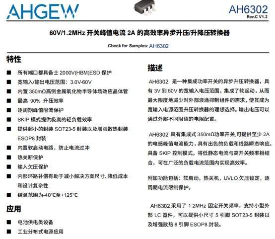 LT1930/LMR64010 兼容替代 AH6302 60V 2A 异步升压 / 升降压DCDC转换器