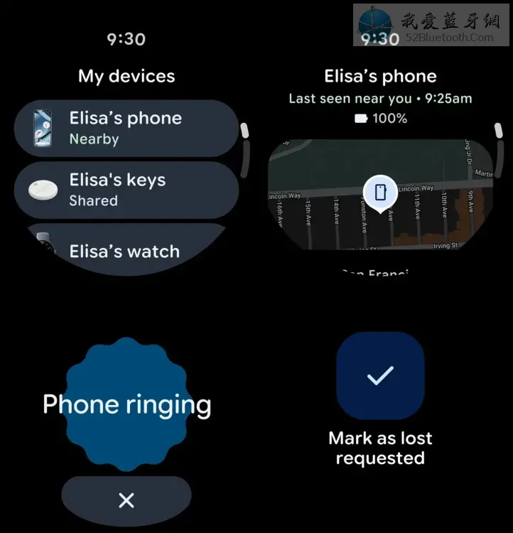 Find Hub查找中心应用。这款Wear OS客户端以"我的设备"列表为起始,展示了所有登录您谷歌账户的设备。选择手机、平板、手表、耳机、追踪器等任一设备,即可进入详情页面。页面首先会显示设备最后出现的时间和当前电量。您可以查看地图视图,点击后可直接在手表上打开谷歌地图,并提供多种模式的路线导航。