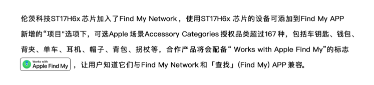 使用伦茨科技ST17H6x芯片的设备接入Find My Network后,可添加到Find My APP新增的“项目”选项下,可适用于上千亿种使用场景,包括钱包、单车、帽子、背包等。 合作产品将会配备苹果“Work with Apple Find My”徽标,让用户知道它们与“Apple Find My Network”和「查找」(Find My)APP兼容。