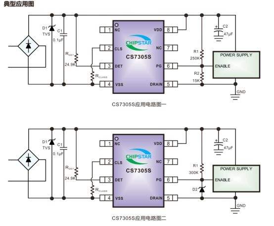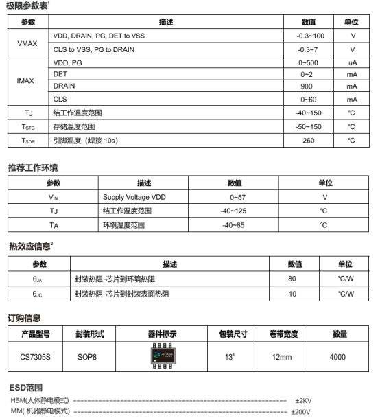 CS7305S是一款与SD4924S完全兼容的以太网供电(PoE)受电设备(PD)控制器,引脚定义、功能特性与外围配置全面匹配,无需修改PCB即可无缝替代SD4924S,适用于网络语音电话(VoIP)、安防摄像头系统、无线接入点(AP)、远程网络供电设备及视频会议终端等场景。芯片符合IEEE802.3af/at标准,输入电压范围0~57V,可承受高达100V电压冲击,集成100V 0.6Ω通路开关MOSFET,浪涌电流限制150mA,直流输入电流限制900mA(典型值),工作结温-40℃~125℃,环境温度-40℃~85℃,采用SOP8封装,与SD4924S封装尺寸一致,安装兼容性拉满。
