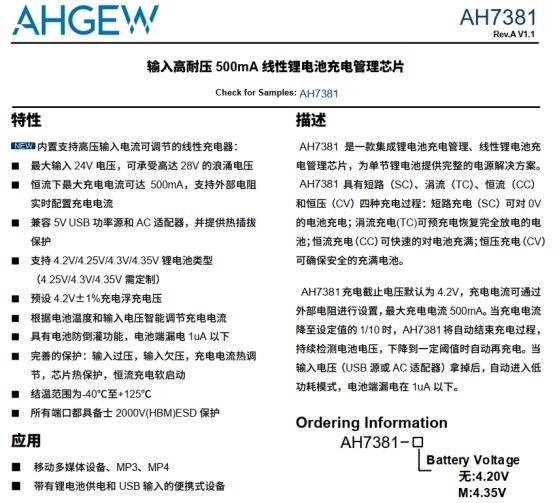 MCP73811替代芯片AH7381:24V高耐压0.5A线性单节锂电池充电管理芯片: