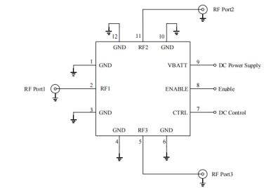 整个开关控制由单一电压输入(CTRL)驱动,根据控制引脚的逻辑电压电平,RF1引脚将通过低插入损耗路径连接至两个射频输出端口(RF2或RF3)中的任一端口,而RF1与另一输出端口之间的路径则处于高隔离状态。内置解码器可为开关提供精确的逻辑信号。