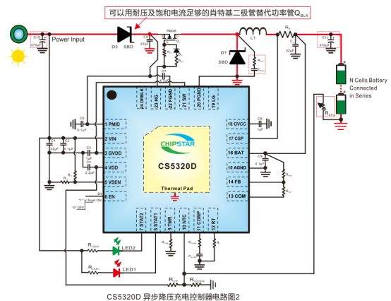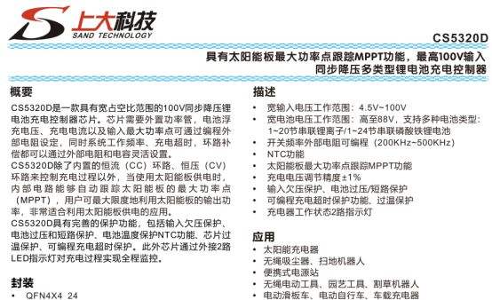 CS5320:MPPT功能,最高100V输入同步降压1-20串多类型锂电池充电ICCS5320D是一款具备太阳能板最大功率点跟踪(MPPT)功能的同步降压锂电池充电控制器,输入电压范围4.5V~100V,电池电压最高支持88V,可适配1~20节串联锂离子电池或1~24节串联磷酸铁锂电池,适用于太阳能充电器、无绳电动工具、便携式电源站、电动自行车等设备。采用QFN4X4_24封装(3000颗/卷),工作结温-40℃~125℃,环境温度-40℃~85℃,ESD防护达±2KV(HBM),热阻52℃/W,需通过PCB散热设计保障高电压大电流场景稳定运行。