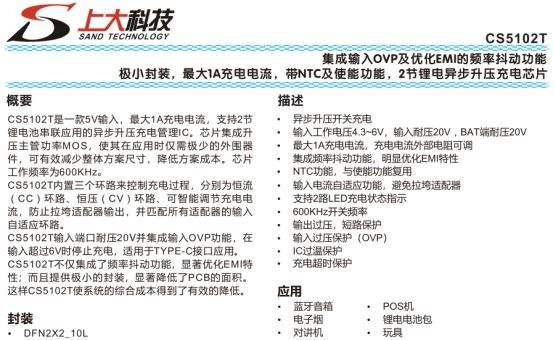 CS5102T是一款专为2节锂电池串联设计的异步升压充电管理芯片,输入工作电压4.3~5.5V(耐压20V),最大充电电流1A,适用于蓝牙音箱、POS机、电子烟、锂电电池包等设备。采用极小的DFN2X2_10L封装,工作开关频率600KHz,集成升压主管功率MOS,外围器件需求少,能有效减小方案尺寸与成本,ESD防护性能可靠。核心功能丰富且实用,支持恒流(CC)、恒压(CV)、涓流(TC)三阶段完整充电,涓流电流为恒流的22%,充电电流降至15%恒流值时自动终止,电池电压跌落至重充阈值(8.207V)时重启充电。内置输入电流自适应功能,可自动调节充电电流,避免拉垮适配器,输入电压稳定在4.29V左右;集成频率抖动功能,显著优化EMI特性,适配对干扰敏感的应用场景。配备2路LED状态指示灯,充电中STAT1常亮、STAT2熄灭,充电完毕则反之,异常情况(过压、短路、温度异常等)时双灯以1.6Hz交替闪烁,状态直观易辨。