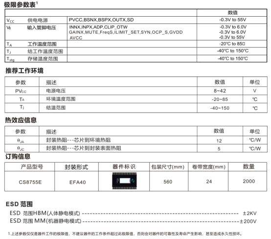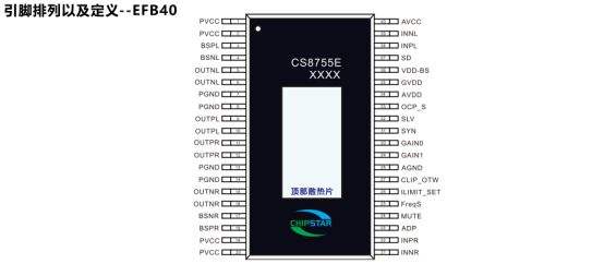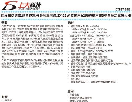 CS8755E 是一款高功率、多功能的 D 类音频功率放大器,支持 2×125W 立体声与 250W 单声道输出,主打四段增益选择、静音控制与多模式适配,采用带顶层散热焊盘的 EFB40 封装,额定工作温度 - 20℃至 85℃,适配车载音频、家庭音响等大功率音频场景,兼具高可靠性与灵活调控性能。
