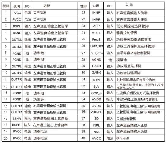 芯片搭载丰富的调控功能,支持四段增益可调(20/30/40/60 倍),通过 GAIN0 GAIN1 管脚组合控制,内部集成对应输入电阻与反馈电阻;开关频率可通过 FreqS 管脚三档选择(悬空 300KHz、接 AVDD 400KHz、接地 500KHz),适配不同 EMI 需求。具备主从模式,通过 SLV 管脚设置主从状态,主芯片 SYN 管脚输出时钟信号,从芯片接收同步,可实现无限级联扩展多路输出;同时配备静音(MUTE)与关机(SD)控制管脚,操作便捷,MUTE 端最高耐压 6V