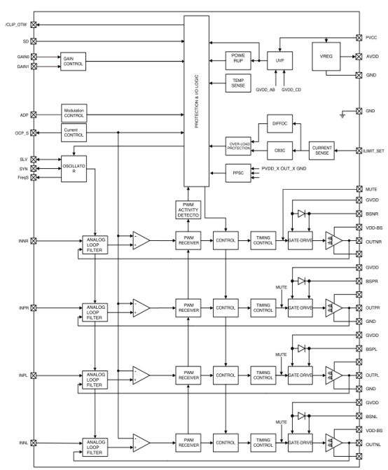 保护机制完善,内置过流、短路、过热保护,过流保护点可通过 ILIMIT_SET 管脚调节,过流后支持自恢复(OCP_S 悬空)或自锁(OCP_S 接地)模式选择;过热保护阈值为 170℃(±15℃容许范围),降温 20℃后自动恢复工作。此外,芯片设有 CLIP_OTW 管脚,可检测音频信号削波与 CB3C 电流保护状态并发出指示,削波时通过注入窄脉冲维持输出活动,避免 PWM 信号停止。