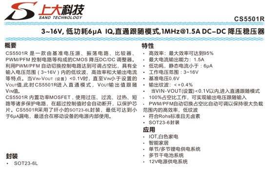 CS5501R 是一款 3~16V 宽输入、超低静态电流的降压 DC-DC 稳压器,静态电流仅 6μA,支持 1.5A 输出能力与 1MHz 开关频率,具备直通跟随模式,当输入输出压差小于 0.1V 时自动进入直通状态,实现 100% 占空比工作。芯片采用 PWM/PFM 自动切换控制,兼顾轻载高效率与满载低纹波,最高效率可达 95%,内置过压、过流、过热、短路多重保护,采用 SOT23-6L 小体积封装,非常适合 IoT、智能家居、白色家电及多节锂电池供电系统。