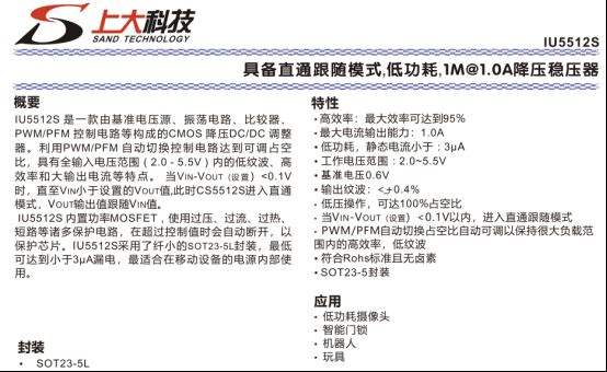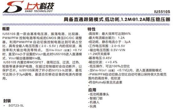 IU5510S 是一款极致低功耗降压稳压器,静态电流小于 3μA,输入范围 2.0~5.5V,输出可从 0.5V 至输入电压,支持 1.2A 输出与 1.2MHz 开关频率。芯片具备直通跟随模式,压差<0.1V 自动进入直通状态,输出跟随输入,轻载效率高、纹波小于 ±0.4%,内置 MOSFET 与全面保护功能,SOT23-5L 封装小巧,是低功耗摄像头、智能门锁、机器人、玩具等续航关键设备的理想选择。