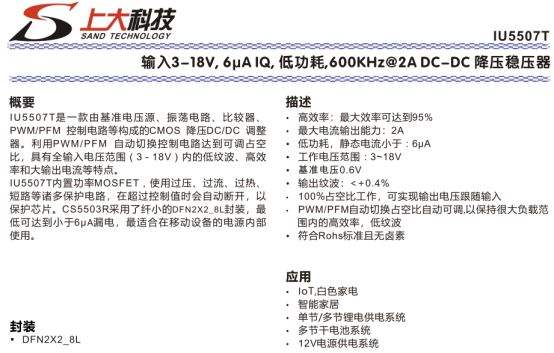 CS5503 属于上大科技低功耗降压 DC-DC 系列,定位小电流、低成本、高可靠性应用,采用紧凑封装设计,支持锂电常用输入电压,具备优秀的轻载效率与低静态电流特性,PWM/PFM 双模式自动切换,在不同负载下均能保持高效转换。芯片集成完善的保护功能,外围极简,适合小型便携产品、低功耗模块、电池供电手持设备等批量应用场景。