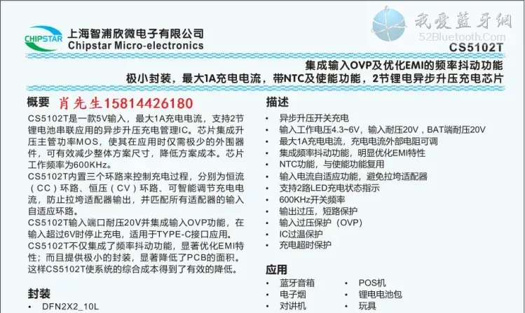 CS5102T是一款5V输入,最大1A充电电流,支持2节锂电池串联应用的异步升压充电管理IC。芯片集成升压主管功率MOS,使其在应用时仅需极少的外围器件,可有效减少整体方案尺寸,降低方案成本。芯片工作频率为600KHz。